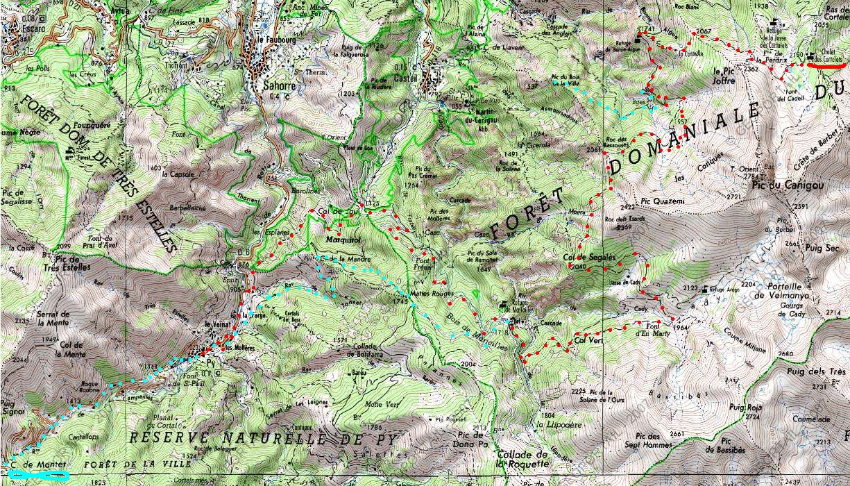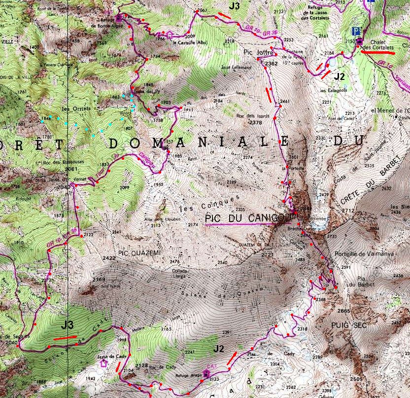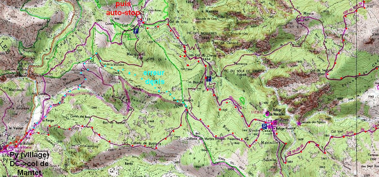 Jour 3 = Refuge des Cortalets 2150m 0h // refuge de Bonne-Aigue 1741m 1h15 // Col de la Jasse d'en Vernet (?) 2040m 3h15 // col de Ségalès 2040m 4h // Refuge de Mariailles 1718m 6h // Mattes rouges 1745m 7h // épingle à cheveux sous le col de la Mandre, 1240m, 8h // village de Py 1023m 8h45 // col de Mantet 1760m 10h (depuis Mariailles Denis tout seul, donc horaires rapides malgré quelques erreurs d'itinéraire)