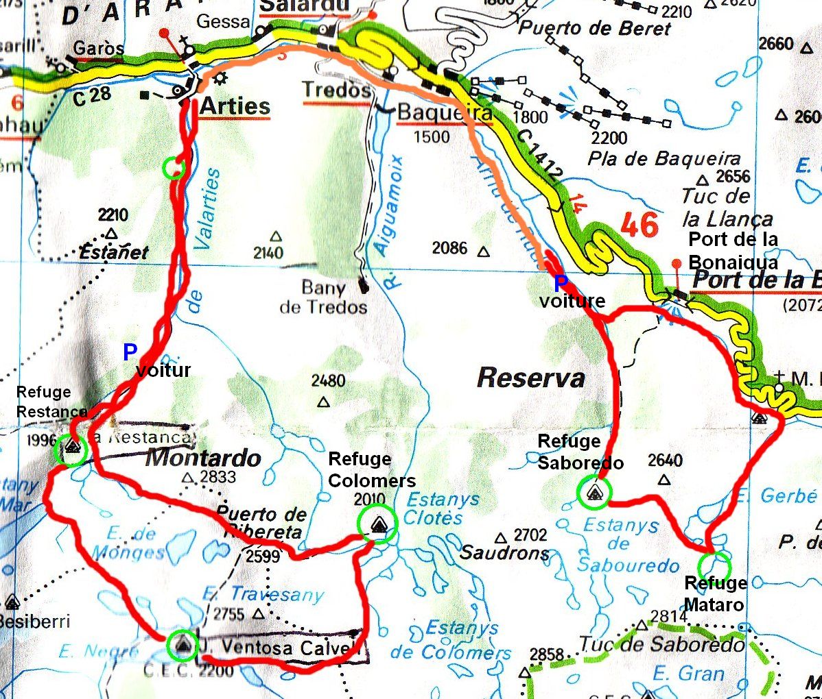 ne pas prende la route (très étroite) à Tredos, mais quitter la C142 après Baqueira, vers une carrière à droite, et quitter ce bon chemin poussièreux
