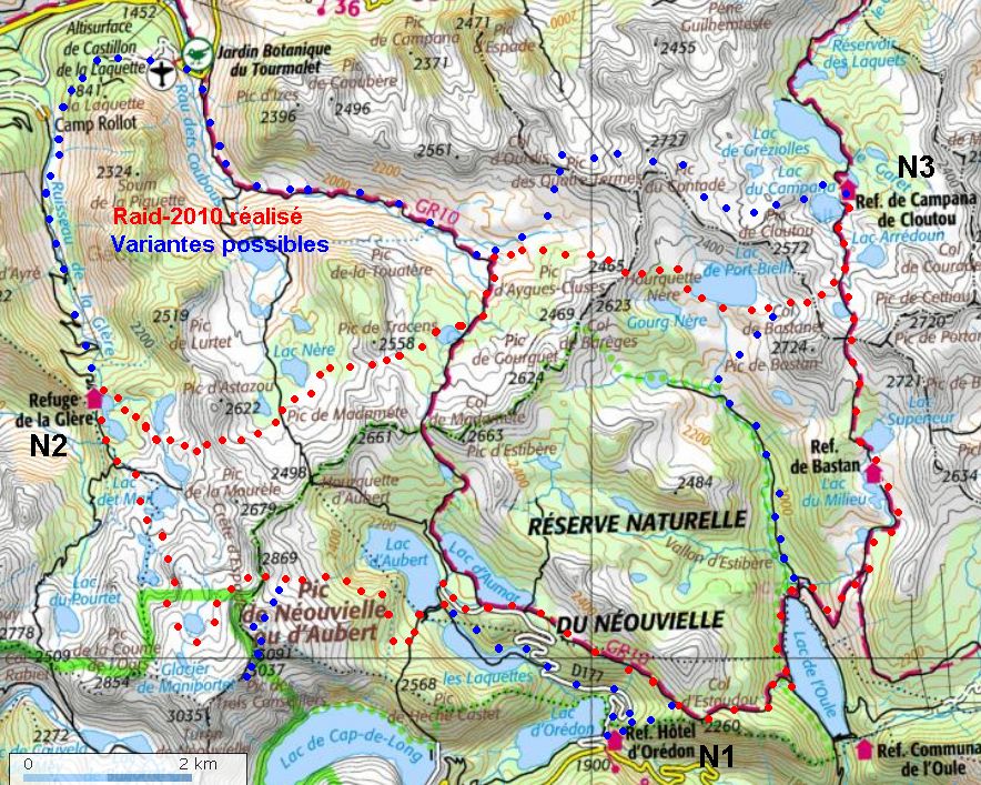 Le Raid-2010-corP a vu passer des Corpet et une future autour du Néouvielle (et au sommet), dans les Pyrénées centrales près de Barrège. Une boucle de trois jours, 3 étapes dont une bien longue, et trois nuits en refuge. Nous étions 7 dont deux dames peu entrainées. Pour le sac, liste sur Que mettre dans son sac de rando ?. Inutile de prendre duvet et matelas (nuits en refuge gardé tous les soirs), mais il faut de bonnes chaussures (passages en altitude, névés, et beaucoup de hors-sentier). Raid en autonomie (on porte nourriture, couverts, butagaz...) mais si vous préférez prendre vos repas aux refuges, ils sont gardés par de bons cuisinier-e-s (pensez à réserver les repas). Nos sacs 2010 pesaient en médiane 7,2kg au départ: Cyr 8.6 kg, Den 7.4, Mei 7.2, Céc 7.2, Guil 6.5, Nath 5.7, Flo 3.7 (gourdes vides).