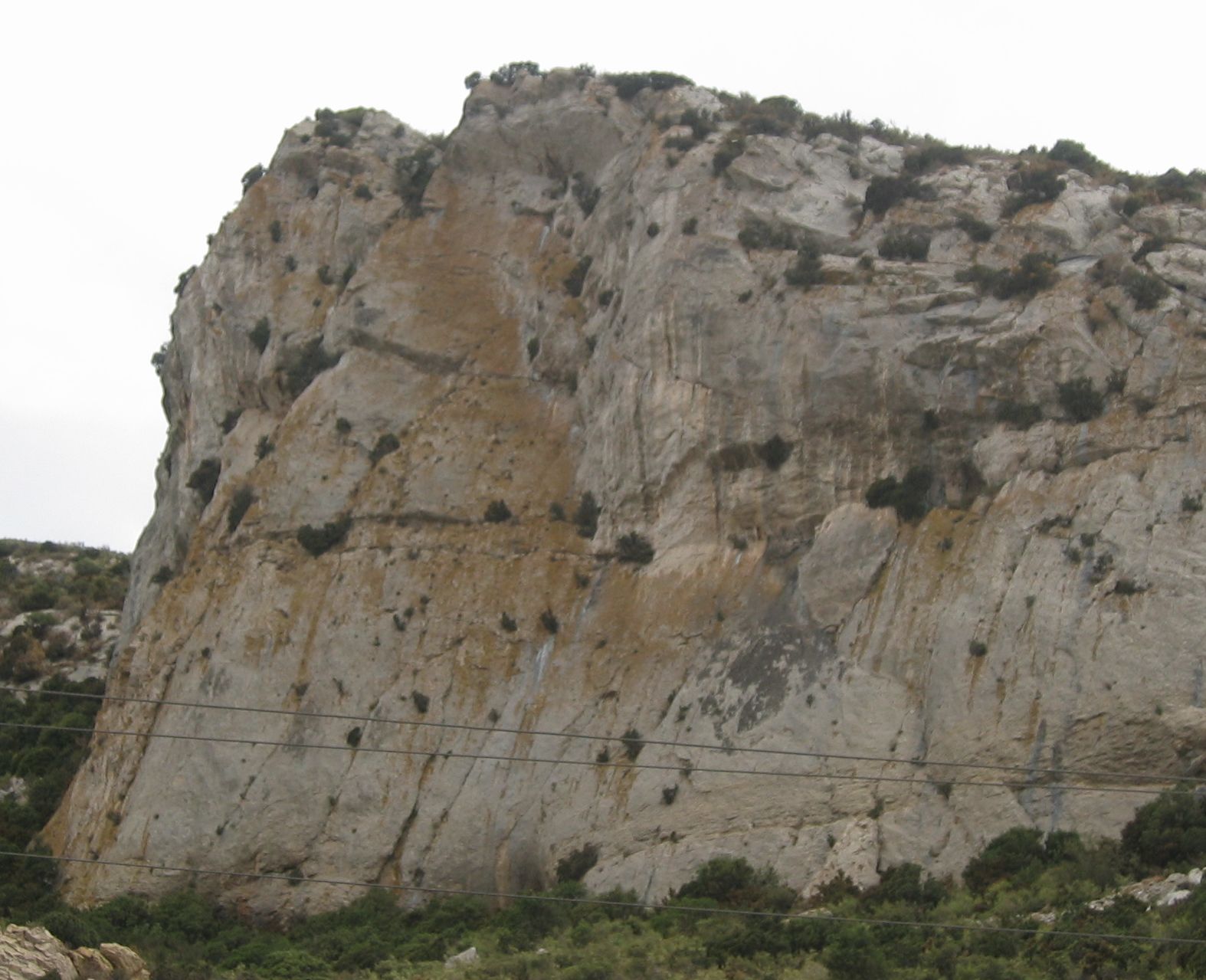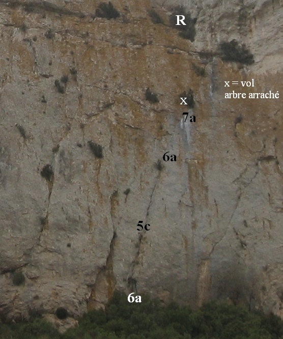 Topo: Monter dans la fissure dièdre en bon rocher (D), orangé de lichens (IV+ IV, V- après le clou à 10m = X vert). On arrive après 15m à un beau cyprès (C), qu'on contourne par la gauche. Au dessus continuer la fissure dièdre qui monte vers la droite (10m, IV+) jusqu'à une fissure horizontale, mini-vire sous mini-toit (v rouge). Traverser facilement 2 m à gauche, et monter dans une niche blanche (N) IV+, dont le toit est pavé de pierres mal ajustées (un clou X vert à Dr, le doubler d'une "pince à sucre"). Monter dans cette niche, et passer le toit (V-V+), pour sortir de la niche vers la droite, vers un cyprès mort (10m, laisser l'arbre vert (A) à gauche). Enfin terminer par 10m plus faciles tout droit (IV+). Au sommet, relai sur coinceur et sangle, mais le vent y souffle terriblement !