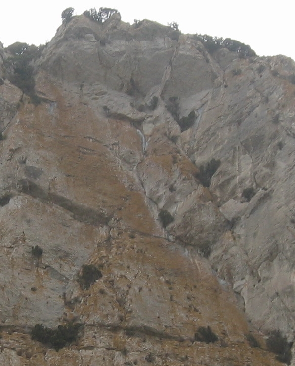 - En face, de l'autre coté du Verdouble, dans la barre qui descend du roc Fourcat: on y voit une belle barre orange et noire, avec une grotte, mais ce doit être le cran au dessus, vu l'inclinaison et la compacité du rocher.
