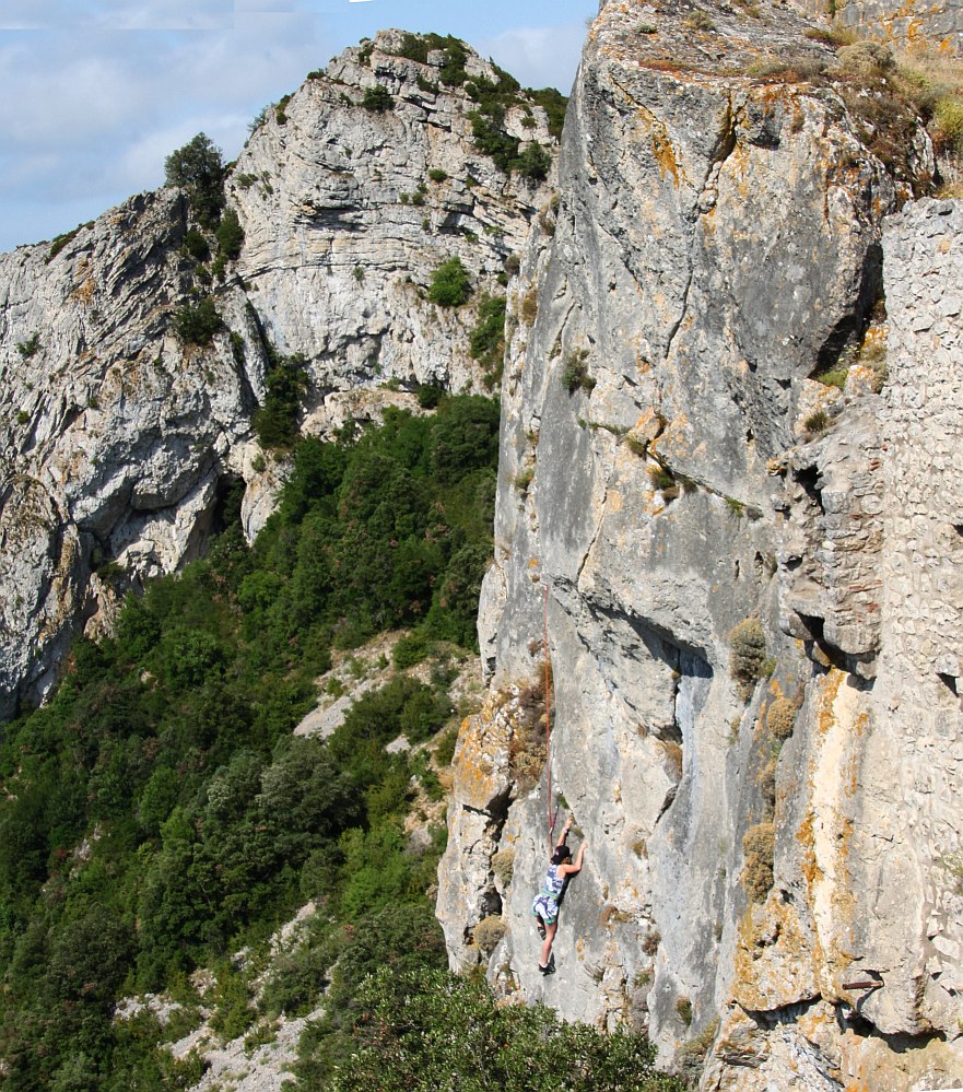 Falaise calcaire, voie courte, AD AD+, exposée. Belle entrée dans ce château cathare