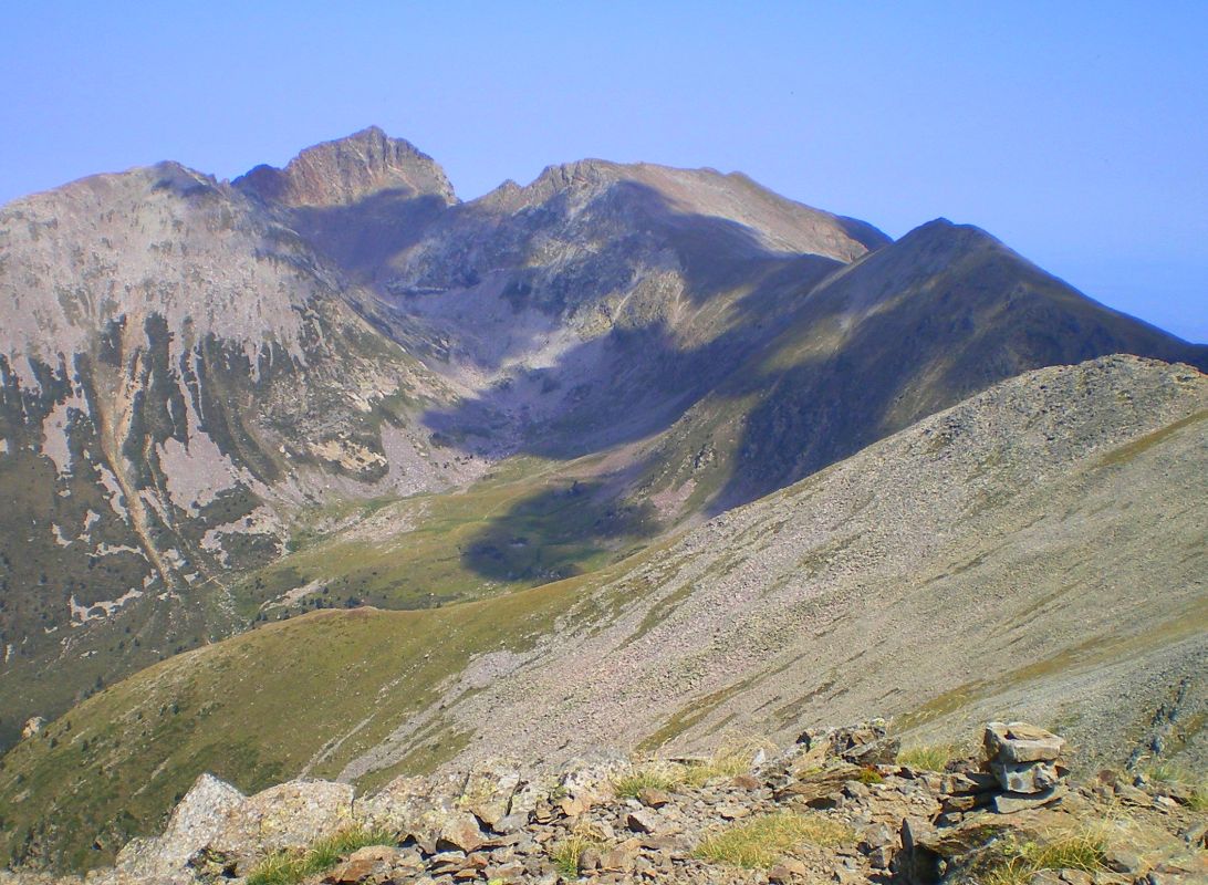 Puig Roja 2724m et Puig dels Tres Vents 2731m, au départ du refuge de Mariailles, en passant par le pla de Guilhem, le col des Boucacers, le pic des Sept Hommes, et en redescendant par les Gourgs de Cady, puis le chemin du Canigou (HRP) qui passe au refuge Arago, et revient à Mariailles par le GR10.