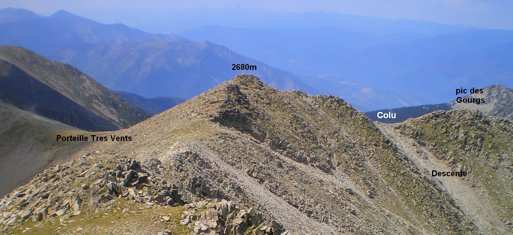 Puig Roja 2724m et Puig dels Tres Vents 2731m, au départ du refuge de Mariailles, en passant par le pla de Guilhem, le col des Boucacers, le pic des Sept Hommes, et en redescendant par les Gourgs de Cady, puis le chemin du Canigou (HRP) qui passe au refuge Arago, et revient à Mariailles par le GR10.
