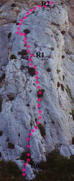 4 longueurs, dont 3 belles. Ouverture de la dernière longueur (R3-R4): Denis en solo 13/8/92 AR Duilhac 1h,