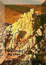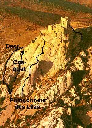 sauvage et plus ouvert qu'à Peyrepertuse: voyez la vue sur la vallée de Maury, avec, au loin, le Canigou ! Un problème majeur est que les personnes qui vendent les tikets pour le chateau sont fortement défavorables à l'escalade, et menacent les grimpeurs "d'appeler les gendarmes". En Aout 2003 il n'y avais PAS d'arrèté municipal interdisant l'escalade (vérifié à la mairie de Cucugnan, le 21/08/03), mais c'est toujours désagréable de se faire "gronder". Depuis l'escalade à Quéribus a été interdite par arrété municipal, dans un rayon de 500m autour du chateau (cf. affiche sur la cahute de vente des billets)
